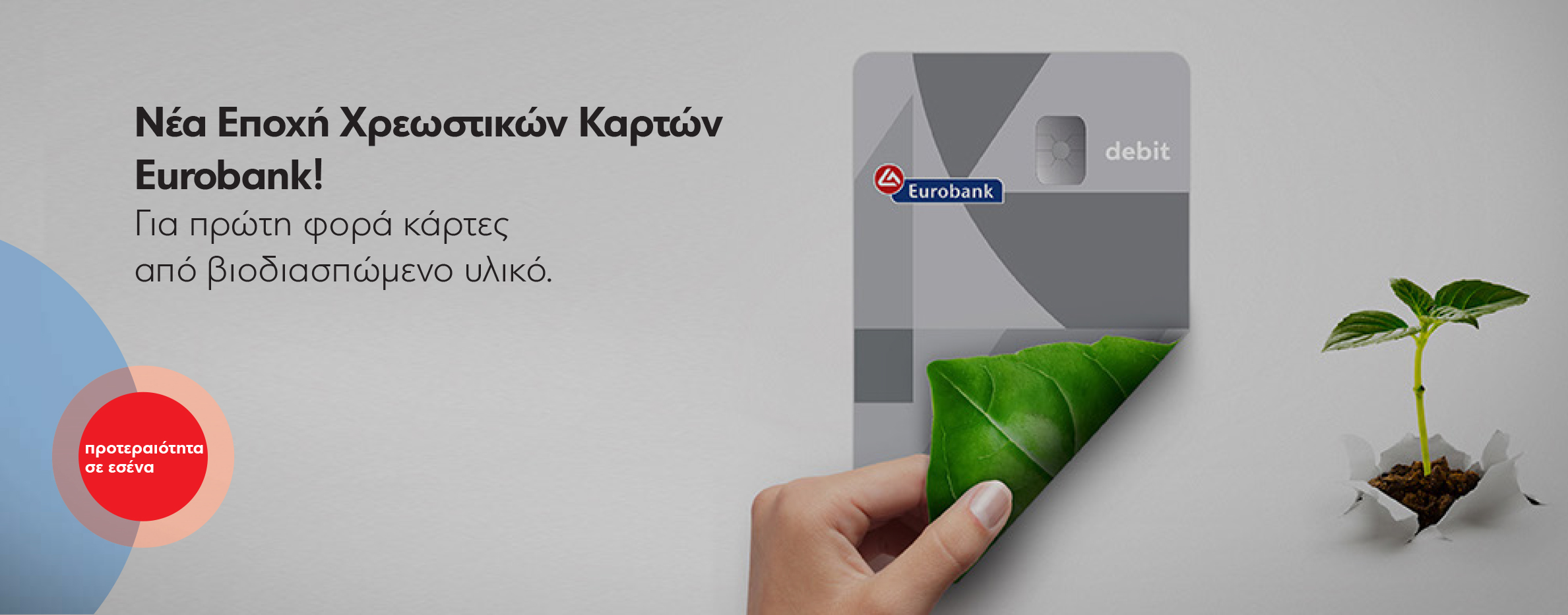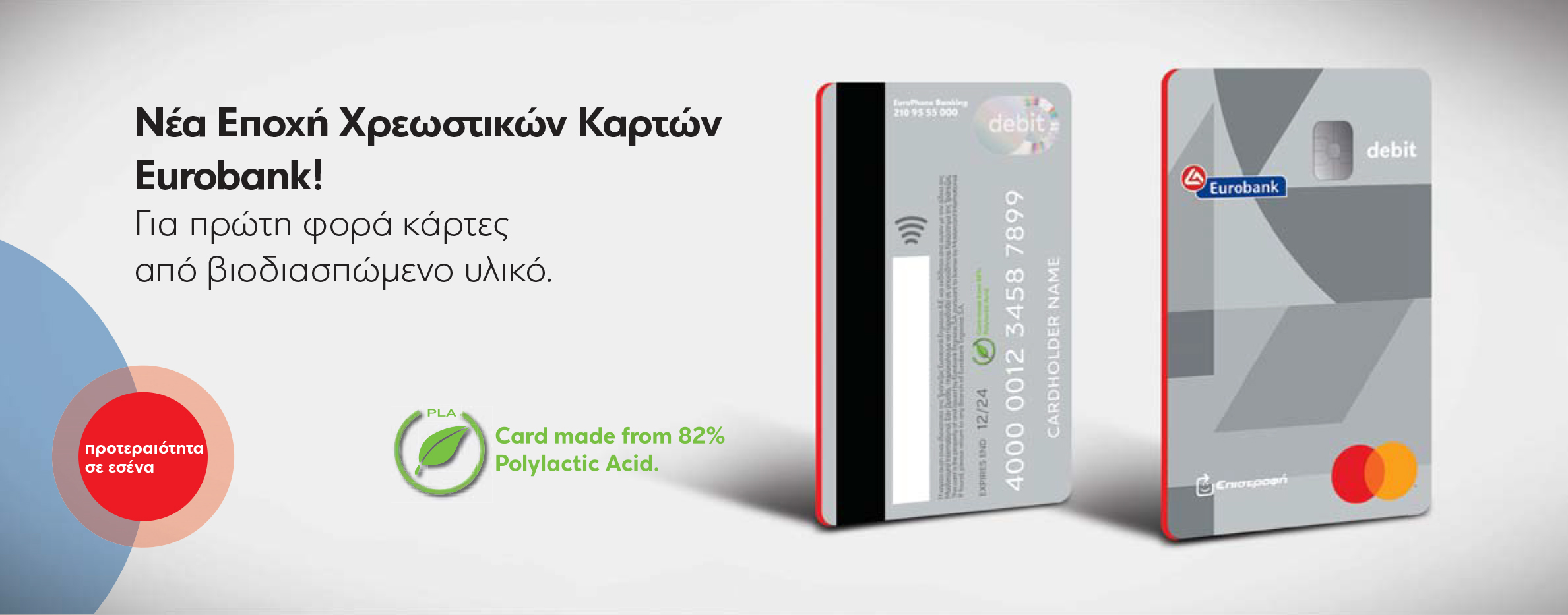 Oλες οι νέες χρεωστικές κάρτες Eurobank για ιδιώτες και επιχειρήσεις, αλλά και όσες χρεωστικές ανανεώνονται ή επανεκδίδονται, κατασκευάζονται από βιοδιασπώμενο υλικό, για την παραγωγή του οποίου απαιτείται μικρότερη κατανάλωση ενέργειας και παράγονται σημαντικά χαμηλότερες εκπομπές θερμοκηπίου.